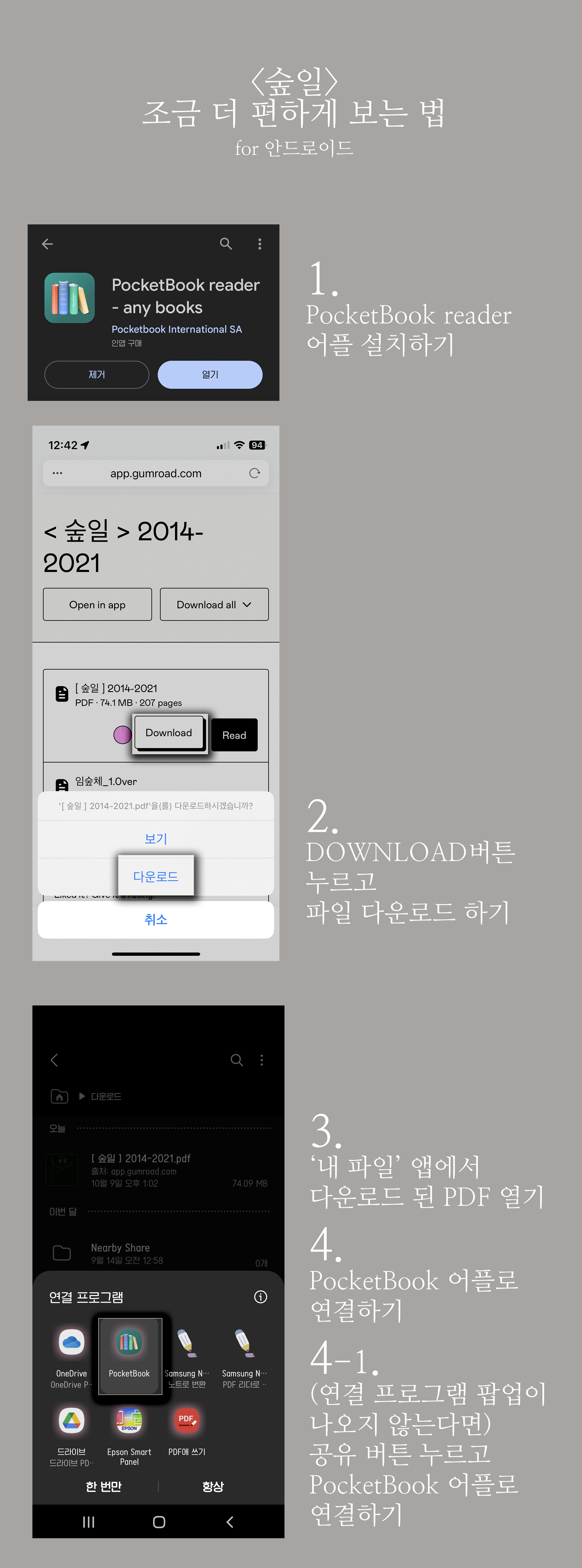 아래 가이드를 이용하시면 더 편리하게 <숲일>을 읽어보실 수 있습니다.